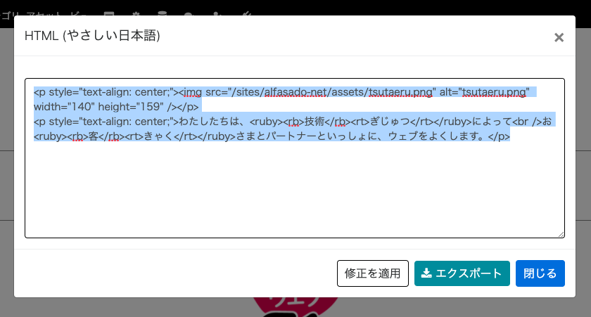HTMLはルビを含めたHTMLソースをコピーし、そのままウェブサイトに活用することができます。「修正を適用」することで修正後の表示確認もできます。